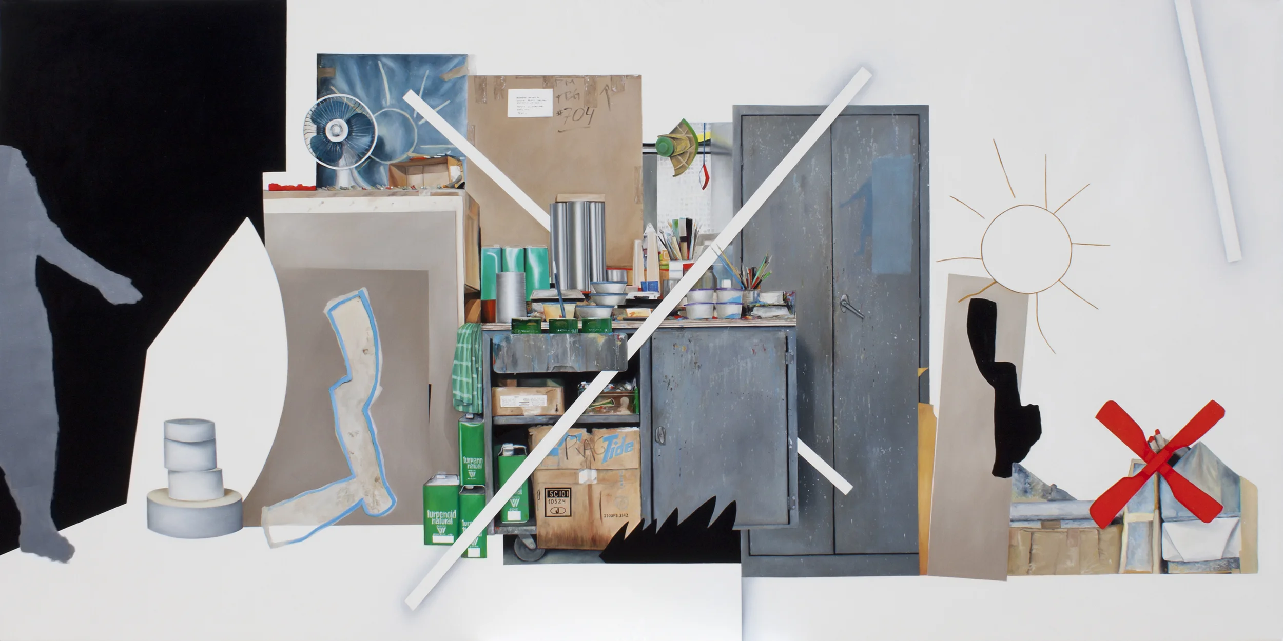 In 2012, my exhibition Heterotopia at Winsor Gallery marked chapter 1 of such a story. It was the first time my studio and the studios of other artists began showing up in my paintings. The journey started in my own studio, where I played around with integrating the paintings and drawings laying around the studio into new paintings. I noticed that when an older painting was reproduced and reworked into a new painting, its original narrative was stripped away. In the context of another painting, it became an actor, helping to tell a whole new story.