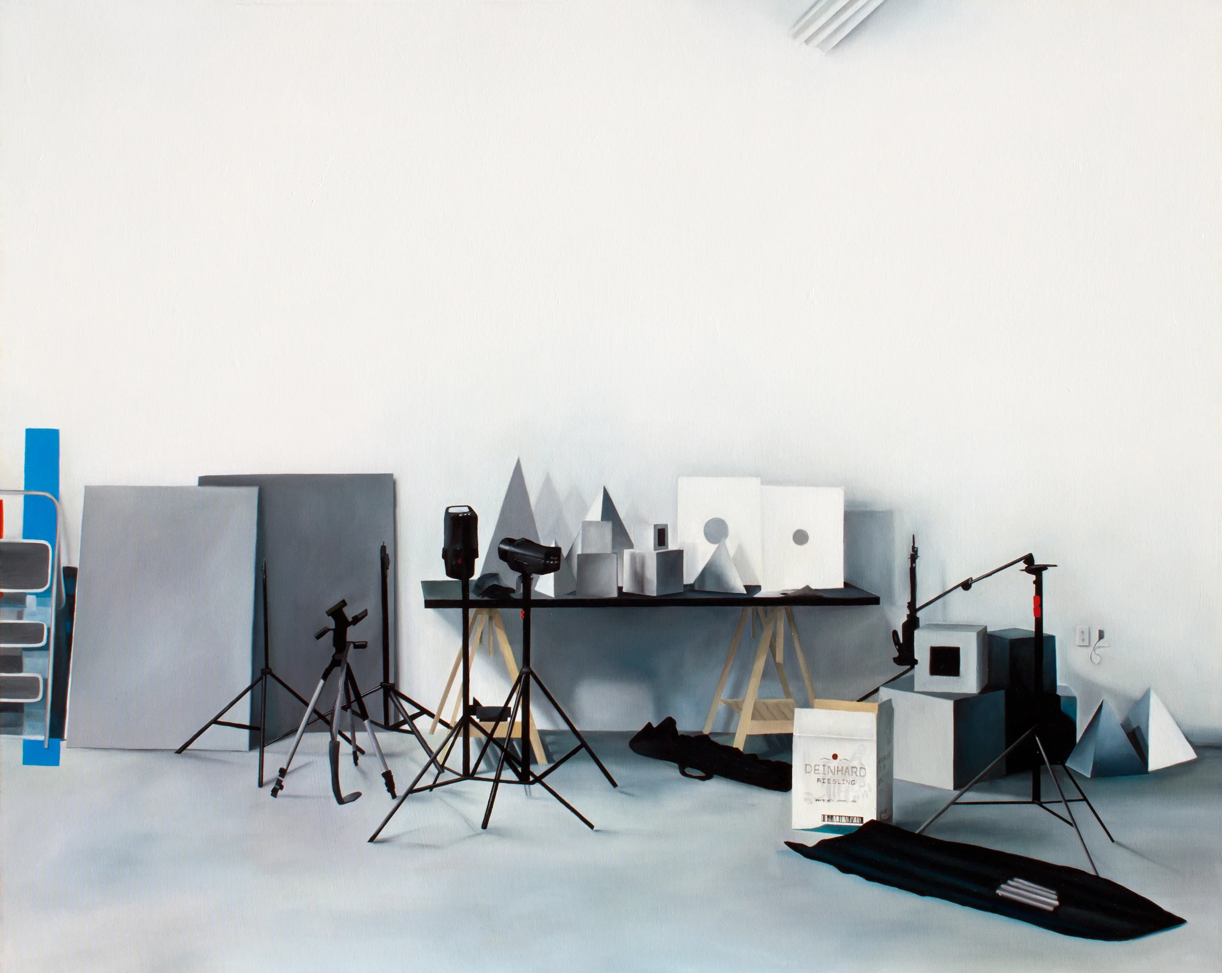 She begins by visiting studio spaces, sometimes with the artist present, but often without the artist; for her, direct artist contact is not required as an essential element of field research. They are not interviewed, the work is not discussed, she focuses primarily on the physical space. Entering the studio, she completes a survey of the space, taking in the elements that immediately stand out, noting interesting voids that should be explored further. After the first general sweep, she photographs and looks more in depth at particular areas, objects and artworks. The visit produces a large number of photographs, a database that includes all types of elements within the space, the lighting, the uniqueness of some things, the everydayness of others, and so on. Often, all of this documentation is promptly filed away. She does not want to be overly familiar with the studio she has just visited before she begins painting. So the images and experience are put to rest, left to simmer on the subconscious backburner. Each studio excavation must be stored long enough that, when it is retrieved again, it can be explored with fresh eyes and intentions.
