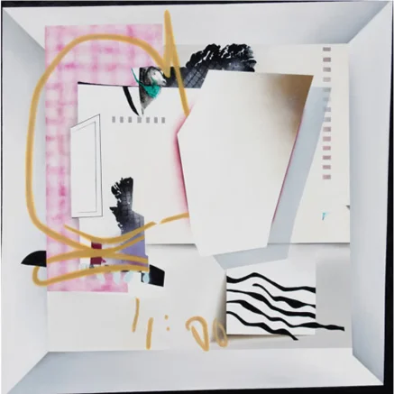Combining colourful gestural brush strokes, repeating angular forms, and hard edge painting in black and white with a stenciled butterfly, the painting Dreams on Zhang Zhou is the first in the series, hanging at the back of the gallery. While the presence of bars and angular forms, ochre lines, and allusions to framing signal the beginning of various motifs throughout the rest of the work, the butterfly in Dreams on Zhang Zhou is the most significant. The butterfly references the Chinese philosopher from the 4th century BC, whose dream of a butterfly prompted the question whether or not it was he, Zhang Zhou, dreaming he was a butterfly, or a butterfly, dreaming that it was Zhang Zhou. Drawn to the story’s ability in sparking the intellectual conversation of what constitutes reality, Ackerman uses it as a philosophical jumping point, for her interest in how creativity, sometimes, accelerates when the body tries to sleep.