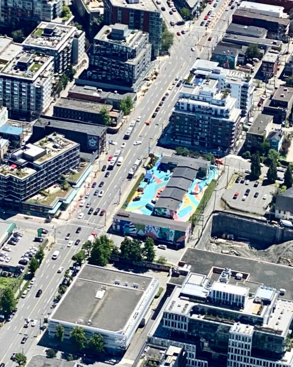 City Centre Motel, 2111 Main St. Vancouver BC. With 30,000 sq ft, painting the entire motel and parking lot was largest mural yet by the Vancouver Mural Festival (VMF). Designed collaboratively by Fiona Ackerman, KC Hall and Joon Lee. 2022